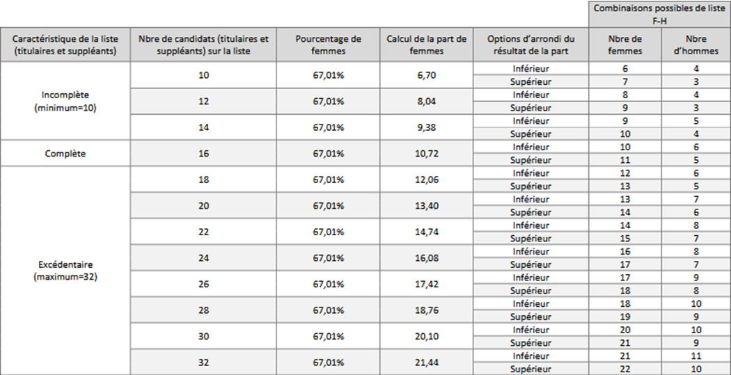Afin de faciliter le travail des candidats, un tableau précisant, pour chacun des scrutins, le nombre minimum et maximum de candidats, ainsi que la répartition homme-femme nécessaire pour constituer des listes doit leur être présenté rapidement.